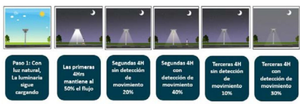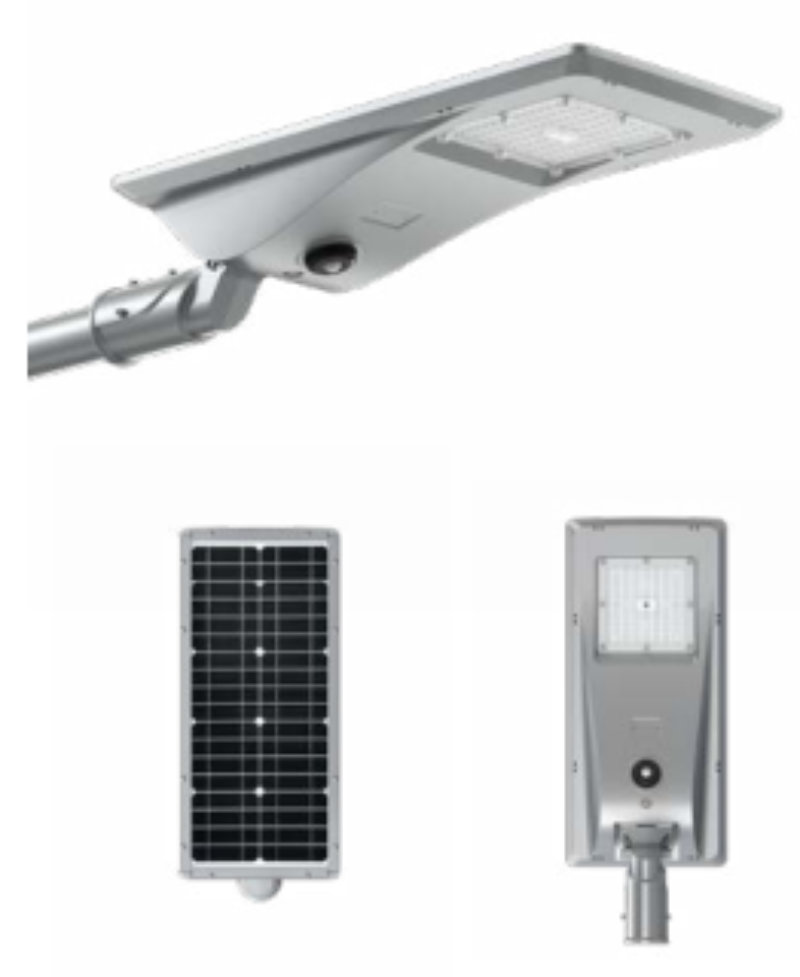 Luminaria LED autónoma AIO (Todo en uno) para iluminación vial, perimetral y senderos para uso exterior. Para instalación en poste o en brazo con ángulo ajustable ±15°. Cuerpo inyectado en aleación de aluminio con acabado en pintura electrostática Akzo color gris. LED SMD de alta eficiencia 30- 60W. Eficacia 180 (±10%) LPW. CCT 4000K. Óptica asimétrica tipo T2 medio en policarbonato. Batería de Lítio-Ferrofosfáto de más de 2000 ciclos. Panel solar fabricado en silicio monocristalino. RA 70. IP 65, IK 08. Con sensor de operación inteligente que garantiza mayor autonomía